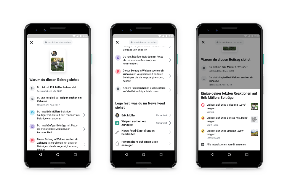 Eine weitere Funktion hält Einzug bei Facebook: Zukünftig sollt Ihr besser nachvollziehen können, warum ein Beitrag in Eurem Newsfeed erscheint. Dies konnte man bisher nur bei Werbeanzeigen einsehen. Demnächst wird im Dropdown-Menü eines jeden Beitrags der Unterpunkt „Warum wird mir dieser Beitrag angezeigt“ zu finden sein. Hinzu kommt die Möglichkeit weitere Einstellungen vorzunehmen. Zunächst wird Euch dort erläutert, warum sich der Beitrag in Eurem Newsfeed befindet, z.B. ob dieser von einer Person, einer Gruppe oder Seite, der Ihr gefolgt seid, stammt. Außerdem werden weitere Faktoren aufgeführt, die einen starken Einfluss auf die Anordnung der Beiträge haben: