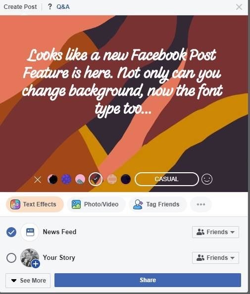 Ein neues Feature wird derzeit in der Desktop-Version von Facebook getestet. Die Funktion „Text Effects“ lässt den Nutzer aus diversen Hintergründen und fünf Schriftarten, welche uns schon aus den Stories bekannt sind, auswählen. Somit könnt Ihr einfacher einen ansprechenden Textbeitrag für den Newsfeed erstellen.