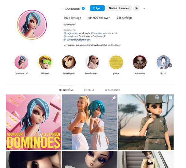 Noonoouri hat Verträge mit renommierten Modehäusern wie Vetements und Versace, besucht Events wie die MET Gala und hat sogar eigene Songs veröffentlicht. Auch als Model steht sie bei der internationalen Modelagentur IMG unter Vertrag und hat mit Heidi Klum und Co. bekannte Kolleg*innen. Ihr Vorteil gegenüber menschlichen Influencer*innen ist ihre Wandelbarkeit – Noonoouri kann innerhalb eines Tages auf dem Empire State Building posieren, ein Unterwasser Modenschau veranstalten oder auf den Kreisen des Jupiters einen Song performen. Sie ist Teil der LGBTQ+ Bewegung, setzt sich für Nachhaltigkeit und Tierwohl ein. Ihr Erfolg zeigt, dass virtuelle Influencer*innen die gleichen Möglichkeiten für Kooperationen und Markenrepräsentation bieten wie menschliche Influencer*innen. Der Kreativprozess hinter Noonoouri ist jedoch zeitaufwändig. Um Live auf einem Event aufzutreten, braucht es Vorarbeit. Für ein Instagram Bild brauchen die Designer*innen mehrere Tage, eine Animation kann zwei Wochen dauern und aufwendigere Produktionen sogar bis zu acht Wochen beanspruchen.